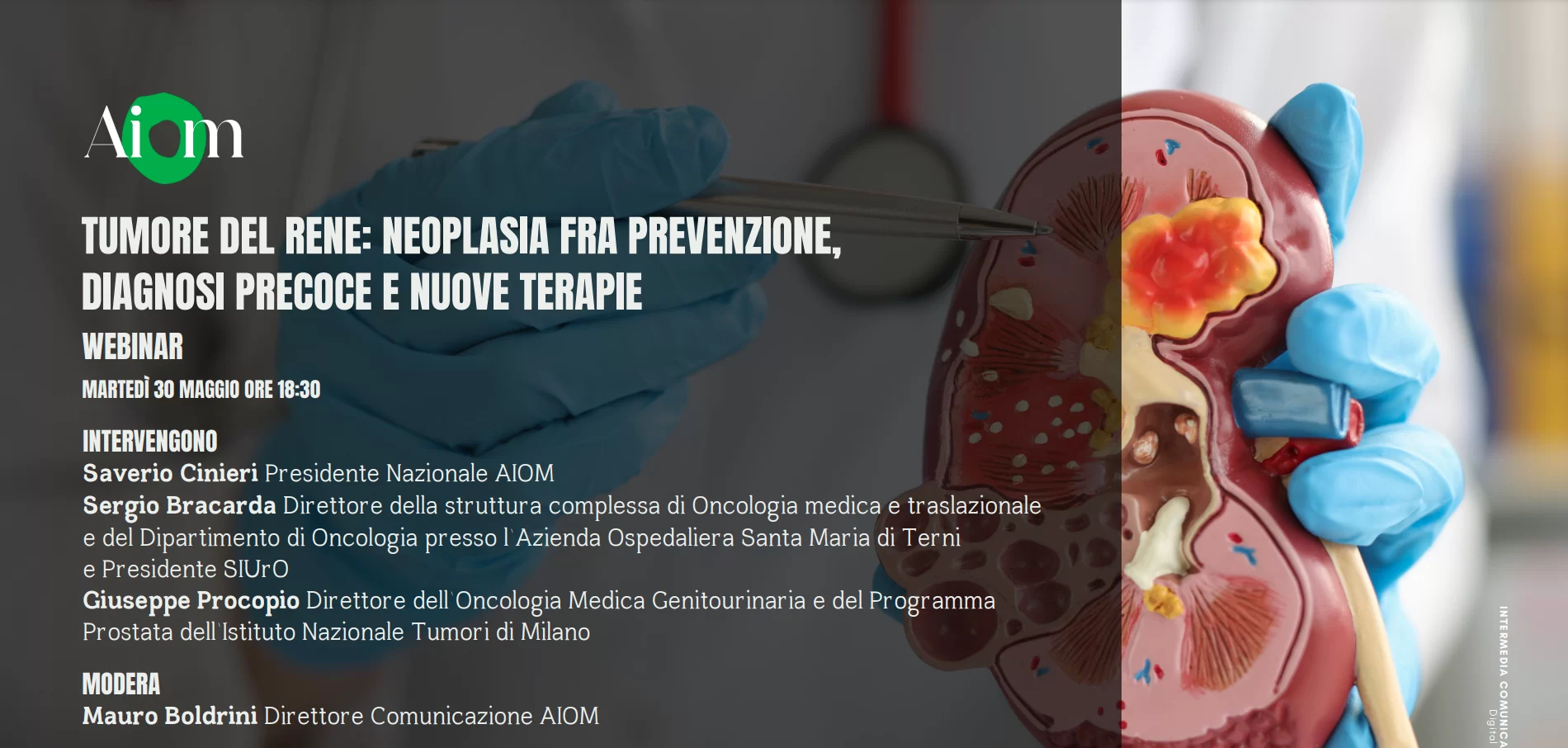 In data 30 maggio 2023, si è tenuto il webinar organizzato da AIOM intitolato “Tumore del rene: neoplasia fra prevenzione, diagnosi precoce e nuove terapie”.